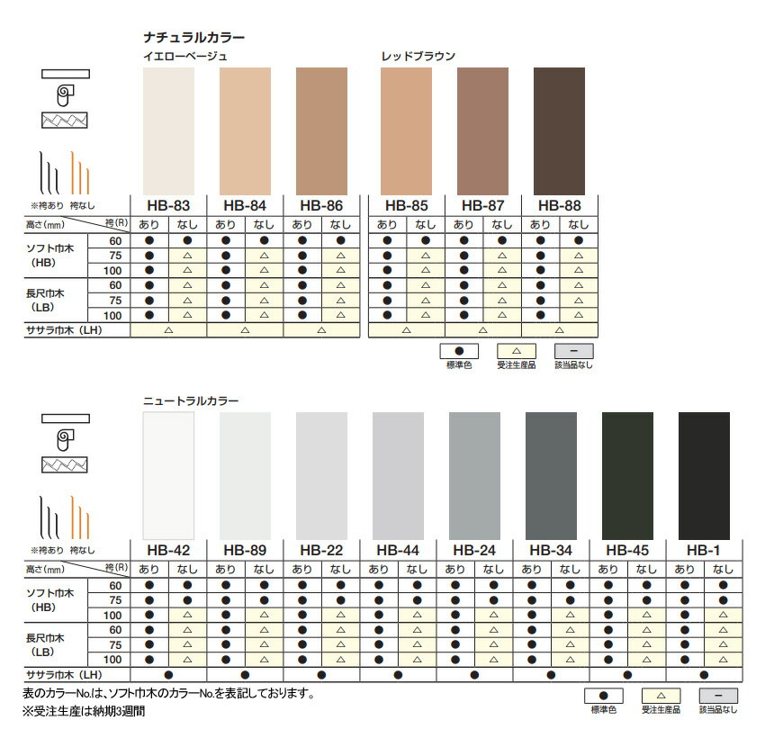 ■巾木サイズ ■断面サイズ ■工 法 品名 高さ(mm) 下地 接着剤 長尺巾木 LBA LBC(袴なし) 60 モルタル 石膏ボード スレート セメントVS 75 100 施工環境、条件による接着剤使い分けの考え方は、メーカーのHPをご覧ください。